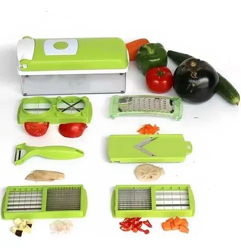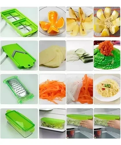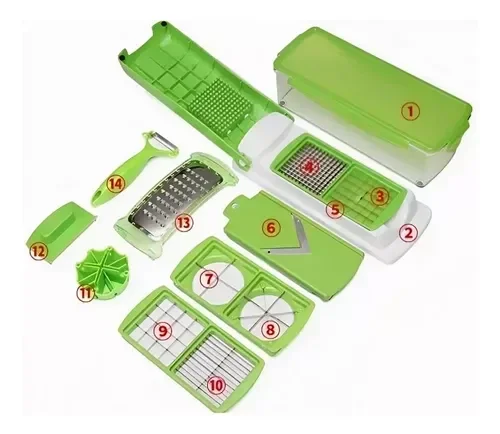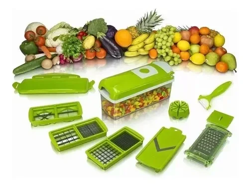 "¡Es el cortador más versátil y práctico del mercado! Podrás cortar, rallar, trocear, laminar, rebanar y pelar de manera rápida y ordenada. ¡Cuenta con once cuchillas distintas para que puedas hacer distintos cortes facilmente!."